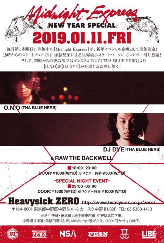 毎月第1木曜日に開催中の【Midnight Express】が、01月11日(金)に新年スペシャル開催!!スケートフロアは、18時より頭脳兄弟による世界最小スケートパークにてスケボー滑り放題!そして、23時からはダンスフロアに「THA BLUE HERB」より【O.N.O】&【DJ DYE】が出演!!お見逃し無く!!