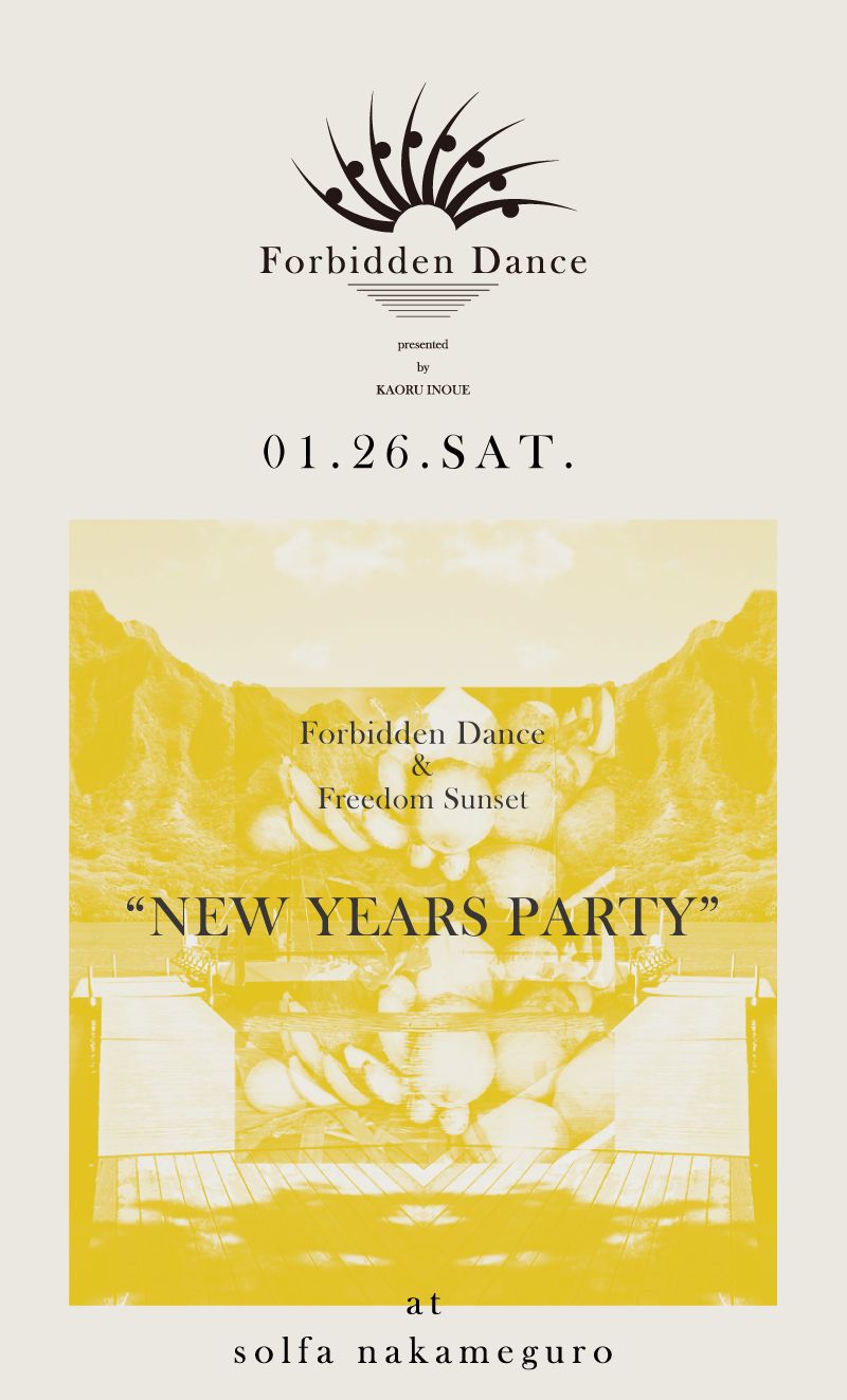 solfaで年始恒例となったKaoru Inoueが主宰する''Forbidden Dance''、湘南発の野外フェス''Freedom Sunset''の両パーティーのコラボレーションによるNew Years Partyが開催。Kaoru InoueとCalmが共演が決定し、初のデイタイムでの開催となり、更に洗練された空間を演出する。