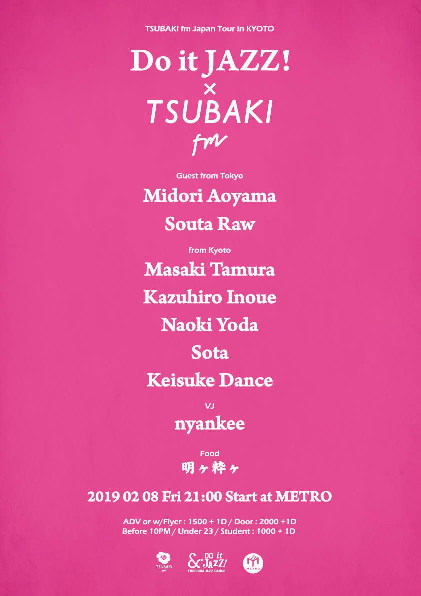 2006 年 に始動以降COLLAGEそしてMETROへと場所を 変え、クラブ以外でも屋上のルーフトップやカフェ・バー、ラウンジ、ショップレセプション、 国際写真展とのコラボレーション等活動を広げ、日本、世界の著名DJを招待し、京都のJAZZ/CROSSOVERミュージックを発信し続けてきた、"DoitJAZZ!"、今回は東京発、インディペンデントミュージックを発信する新しい音楽プラットフォーム『TSUBAKI FM』とコラボレーション。 TSUBAKI FM 仕掛け人であり東京Contactで開催されている人気ハウス・ミュージックパーティ 「Eureka!」 を率いる "Midori Aoyama"。そして良質な音楽を発信し続け音好きに定評のある ”AoyamaTunnel”にてレギュラーとして活躍、玄人をうならせる選曲の ”Souta Raw”が登場。迎え撃つは京都同世代の職人的DJsとDoitJAZZ!レギュラーDJs。Jazz,Soul,Funk,DIsco,Boogieから最新のHouse / Crossoverまで良質な音楽空間をお届けいたします。