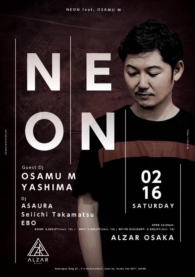ASAURA,Seiichi TakamatsuとEBOでお送りする、ALZARで安定の人気を誇るパーティーNEON。3月末のALZAR閉店に伴い今回がALZARで行われるNEONの最後であるゲストは、東京からWOMB、ageHaを始めとする都内主要クラブを中心に、FUJI ROCK FESTIVAL など、様々なフェスやビッグイベントにも出演しているOSAMU Mと関西から多くの人気パーティーをオーガナイズし、Sasha、John Digweed、Francois K、Nick Curlyなど数々のTOP DJと共演したYASHIMAが参加!