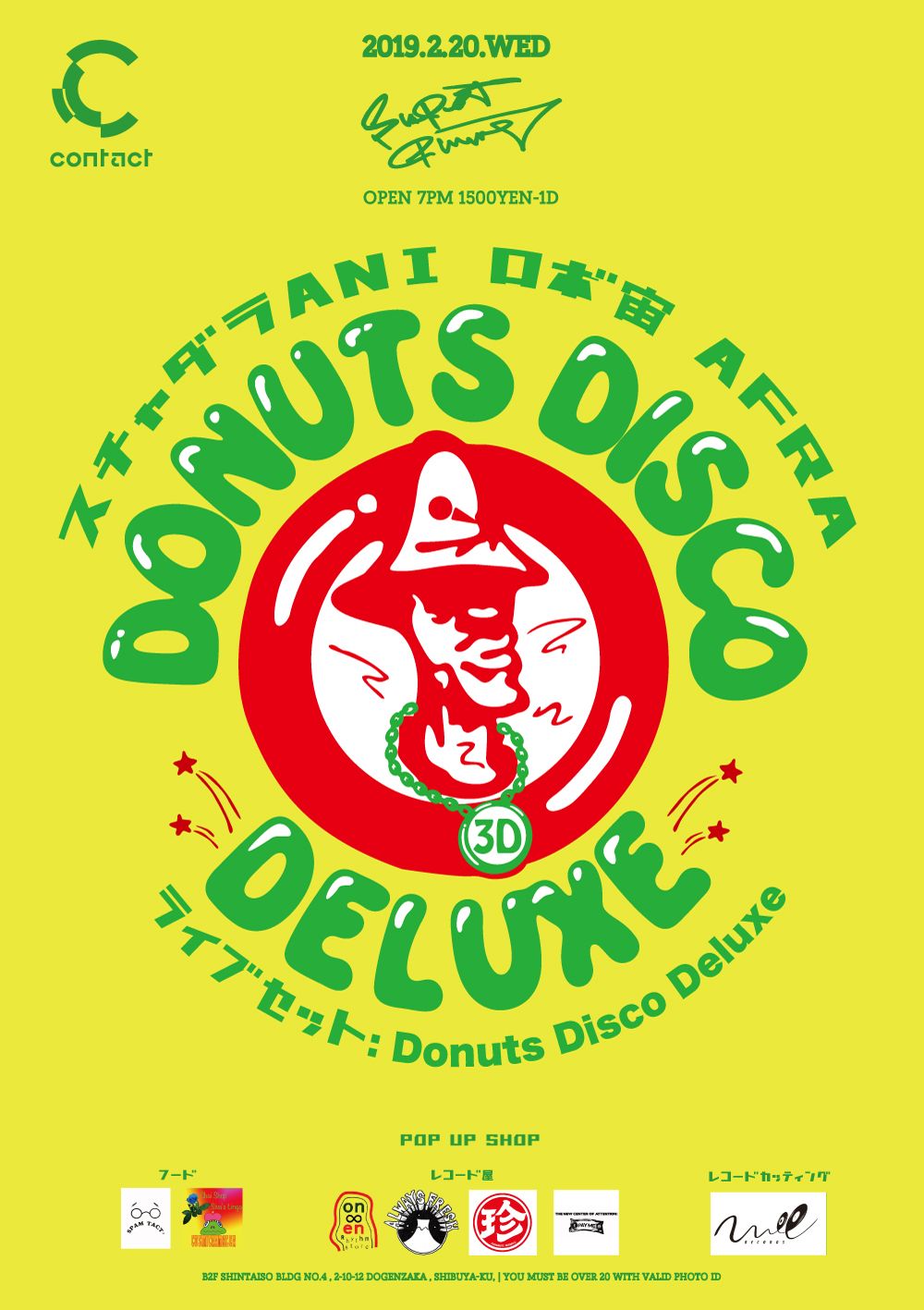 偶数月、第3水曜日を彩っているDONUTS DISCO DELUXE。スチャダラANI、ロボ宙、ヒューマンビートボクサーのAFRAからなるこのユニットは、70年代当時ゲットー地域ブロンクスで行われていた違法野外パーティ“ブロックパーティ”のライヴ感や熱量を現代にアップデートしている。ヒップホップ、ソウル、ファンク、ディスコを軸に、DJ、MC、ヒューマンビートボクサーと3人3様の芸当を畳みかけるように繰り出すそのスタイルは、音楽やパーティ本来の楽しさを教えてくれると共に独自のパーティ感を作り出している。毎回ポップアップコーナーを設け、フードやレコード店、アーティストによるレアなグッズ販売店も並んでいる。