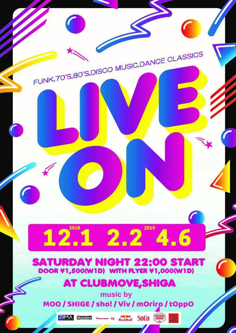 ~LIVE ON~はファンクを中心にソウルやダンスクラシックスなどの70年、80年代のブラックミュージックの土臭く泥臭い本質をさらに追求する内容に!MOVEでお馴染みの出演者 & レギュラー出演者の中でも特にブラックミュージックを愛するメンバー達が集結。メンバーが自信を持って「踊れる選曲」をPLAY!!ファンキー & レアなグルーブはフロアーに至福の時間をもたらします!