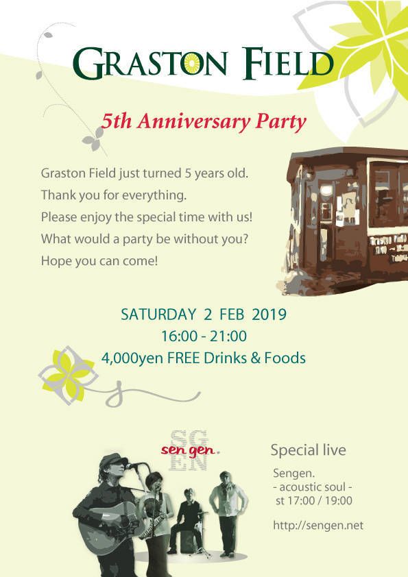 2019年2月2日、逗子の名店、Graston Fieldの5周年記念パーティ開催! 16時~21時まで4000円でフリードリンク&フード。ゲストライブはアコースティックソウルバンドの"Sengen."