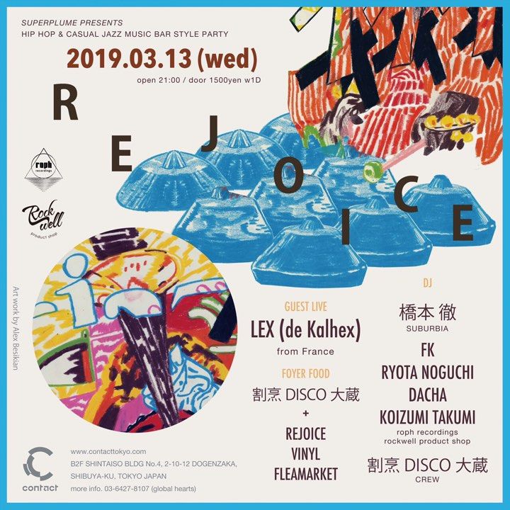 Rejoiceは選曲家 橋本徹、Nujabesのマネージャーやレーべルマネージメントを務め、現在は〈roph recordings〉をマネージメントするKoizumi Takumi、〈Hydeout Productions〉の旗艦店〈Tribe/Guinness Records〉からリリースし、同店のスタッフでもあるFKを中心に、腕利きのセレクターが音楽を担当する。“等身大かつ自分達にとってリアルなジャズやヒップホップ”、“本当に音楽を愛する人たちが安心して和める場所”をコンセプトに掲げ、ジャズ&ヒップホップを中心に良質な音楽を気ままに楽しめるイベント。
