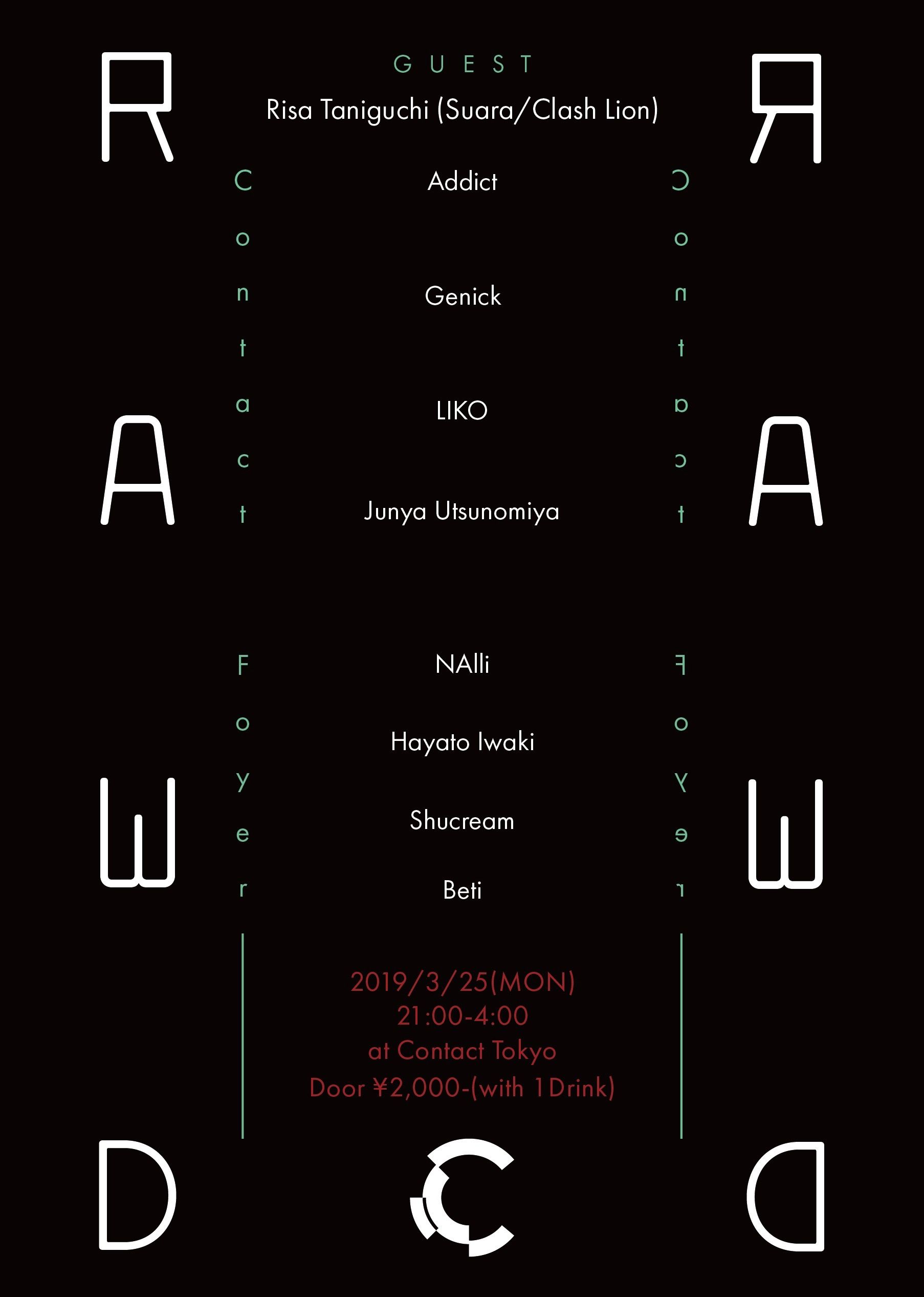 平日深夜のContactをストイックなサウンドで踊り明かすJunya Utsunomiyaが主催する新パーティが始動。テクノ/テックハウスを中心に一晩中踊り続けることのできるアグレッシブなContactフロアと、ジャンルを問わずディープなサウンドでゆったりとした時間を過ごすことのできるFoyerの2フロア構成。次世代を担うアーティスト達によって紡ぎ出されるサウンドと空間に要注目。