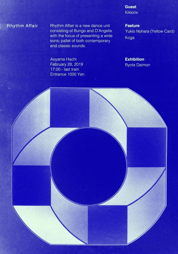 2019.02 28 FEB Rhythm Affair HOUSE TECHNO DISCO 0 Shares Facebook Twitter google Line DATE: 2019-02-28 THU OPEN: 17:00 VENUE: PRICE: DOOR: ¥1000 LINE UP: ■Guest DJ Kikiorix ■Feature Yukio Nohara (Yellow Card) Koga ■Host bungo D’Angelis ■Art + Exhibition Ryota Daimon