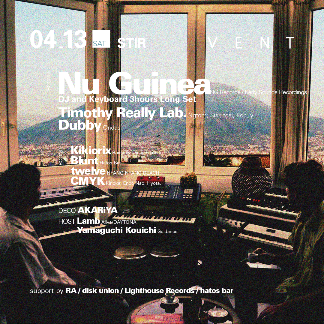遥か遠くの地を思い起こさせるエキゾチックなサウンドにシンセサイザーが溶け合い、ハンドメイドな感覚を残しながらも素晴らしいディスコ・ファンクの作品をリリースしてきたNu Guineaがついに超待望の初来日公演を4月13日に開催されるSTIRにて披露する!!