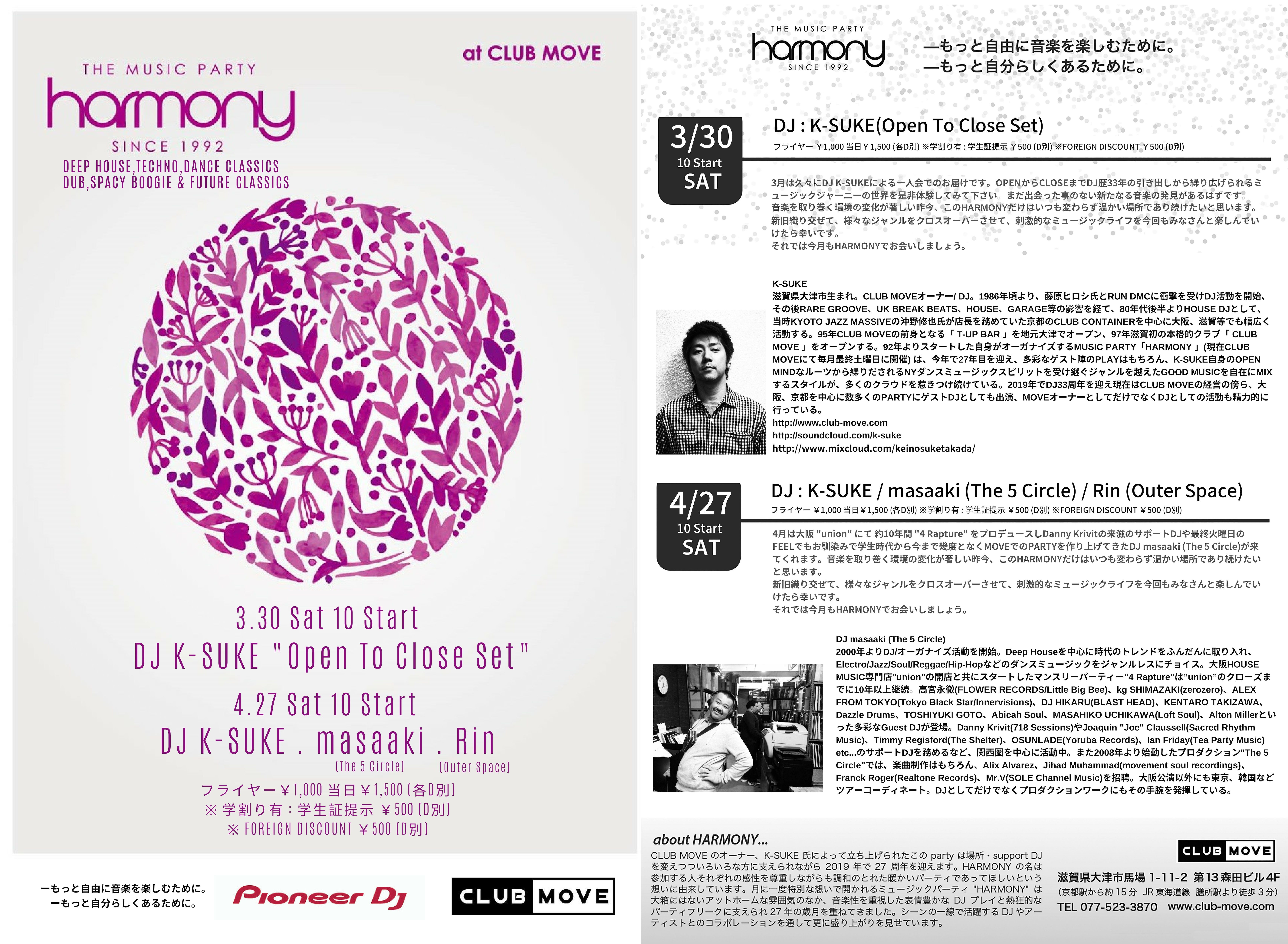 滋賀県大津市生まれ。CLUB MOVEオーナー/ DJ。1986年頃より、藤原ヒロシ氏とRUN DMCに衝撃を受けDJ活動を開始、その後RARE GROOVE、UK BREAK BEATS、HOUSE、GARAGE等の影響を経て、80年代後半よりHOUSE DJとして、当時KYOTO JAZZ MASSIVEの沖野修也氏が店長を務めていた京都のCLUB CONTAINERを中心に大阪、滋賀等でも幅広く活動する。95年CLUB MOVEの前身となる「 T-UP BAR 」を地元大津でオープン、97年滋賀初の本格的クラブ「 CLUB MOVE 」をオープンする。92年よりスタートした自身がオーガナイズするMUSIC PARTY「HARMONY 」(現在CLUB MOVEにて毎月最終土曜日に開催) は、今年で27年目を迎え、多彩なゲスト陣のPLAYはもちろん、K-SUKE自身のOPEN MINDなルーツから繰りだされるNYダンスミュージックスピリットを受け継ぐジャンルを越えたGOOD MUSICを自在にMIXするスタイルが、多くのクラウドを惹きつけ続けている。2019年でDJ33周年を迎え現在はCLUB MOVEの経営の傍ら、大阪、京都を中心に数多くのPARTYにゲストDJとしても出演、MOVEオーナーとしてだけでなくDJとしての活動も精力的に行っている。
