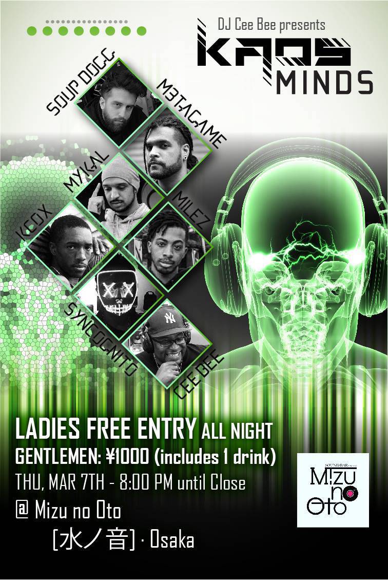 Experience Kaos Minds is showcased each 1st and 3rd Thursday of the month. Resident DJ Cee Bee [Kobe House Music][Kaos Minds], alongside: M3tagame, Soup Dog, DJ Syncognito, and "Live MC" Mykal Daley. Guest DJ Milez and Kerian Cox Diverse Percussionist.