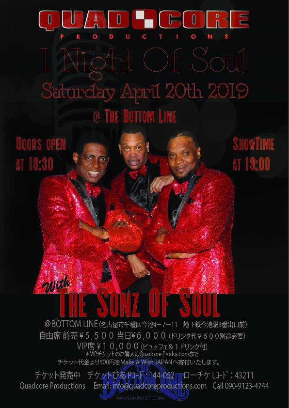 2019.04 20 APR 1 Night of Soul SOUL R&B FUNK 0 Shares Facebook Twitter google Line 実券をお買い求めの方はこちらからご購入頂けます。 ¥ DATE: 2019-04-20 SAT OPEN: 19:00 VENUE: PRICE: advanced general admission 5,500yen at the door 6,000yen VIP Tickets 10,000yen LINE UP:
