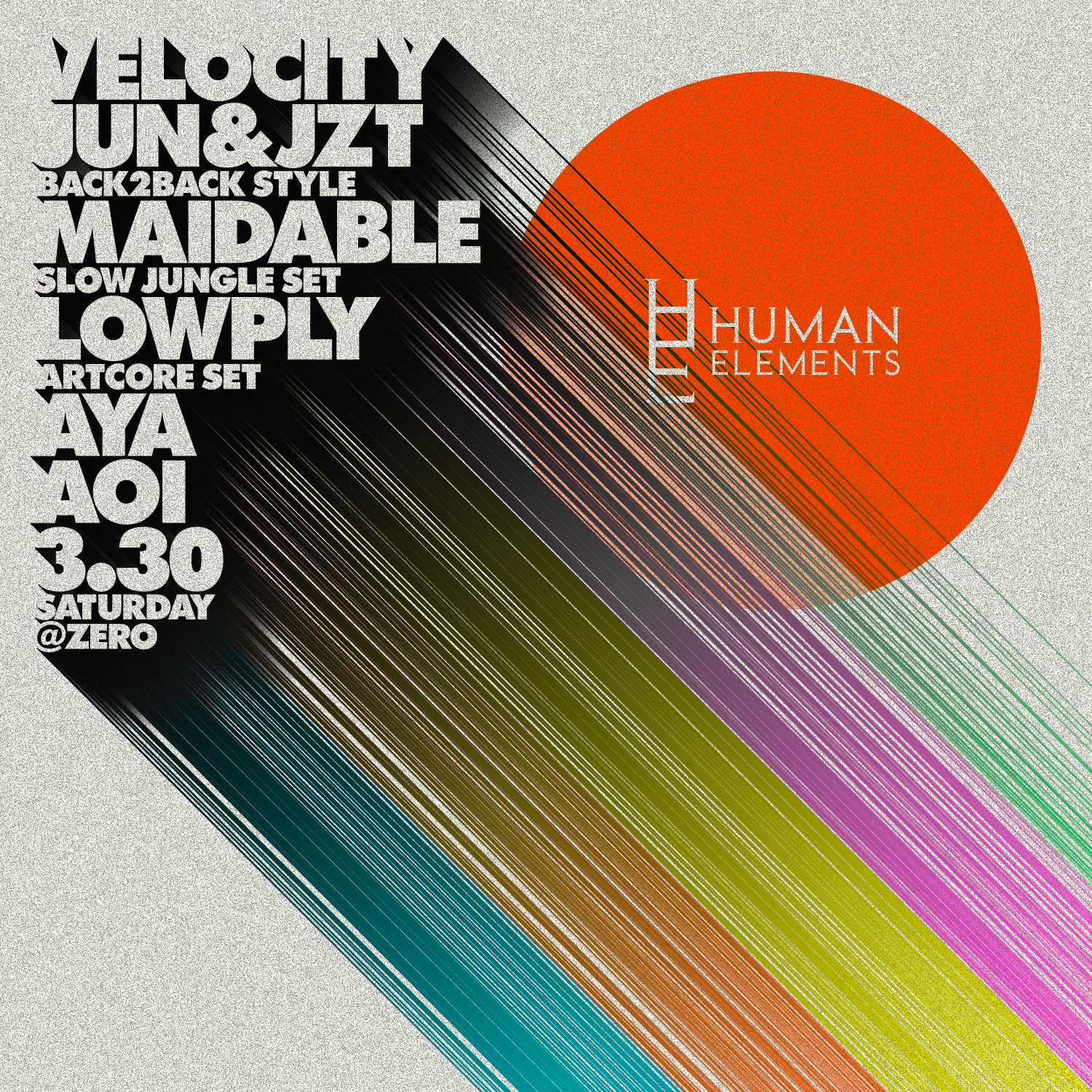 そして今回、Human Elements に Jun が待望の初登場となる! 今年22年目となる Just Drum&Bass Party “Soi” の中核を担う Jun は、まさに BPM に捉われないプレイで、今回のセッションの中心をとなる DJであり、Human Elememts レジデントの J.Z.T とのスペシャル B2B を披露する。同じく初登場となる Maidable は、オリジナルトラックが老舗 Rubik Records よりリリースされるなど注目の DJ / Producer で、今回は Slow Jungle を中心とした選曲を披露する。