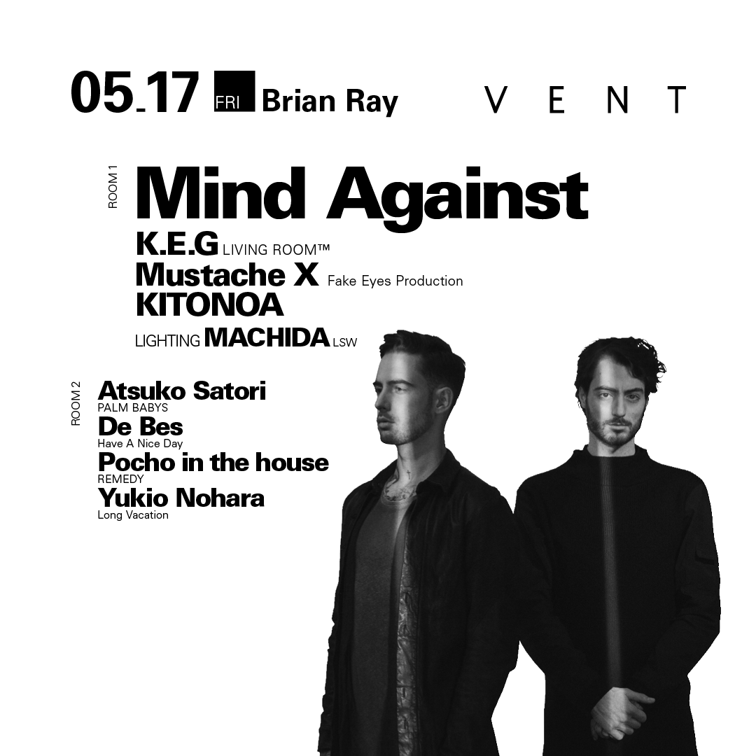 今回Mind Againstが出演するパーティーBrian Rayは、1978年生まれで同い年のK.E.GとMustache Xがタッグを組んでVENTにてスタートさせた全く新しいスタイルのハウスミュージックパーティー。昨年の5月に行われたローンチパーティーでは、Talabomanを招聘し大好評のうちに幕を閉じた。多くのリスナーに魔法をかけてきたMind Againstの神業とも言えるプレイに魅了されてほしい!