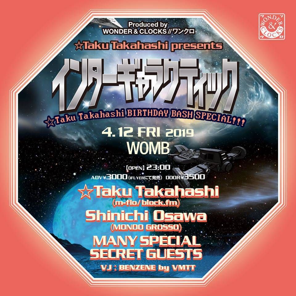 きらめくサウンドの光線、宇宙をも照らすエネルギー ☆Taku Takahashi のバースデイを祝う今回の『インギャラ』は、驚きの人気アーティストなど多数のシークレットゲストが登場!そのサプライズ満載の全貌は、4/12(金)の WOMB にて!!