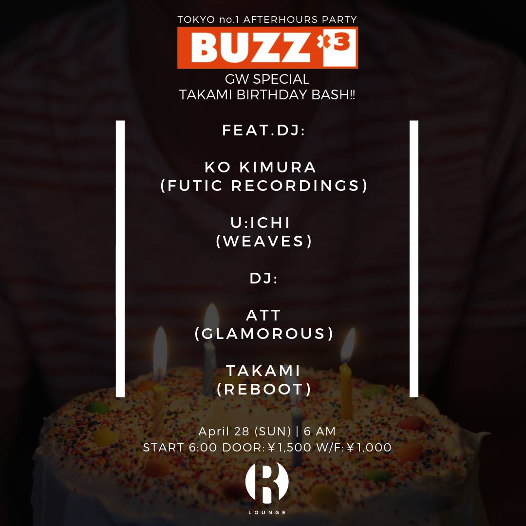BUZZ×3だからこそ可能な各DJのコンビネーションが創りだす音の科学反応、アフター・アワーズの至福の瞬間を体感して欲しい。さらに、レジデントDJ TAKAMIのBirthday bash!と、お祝いムードも満載でのGWスペシャルとなる!!