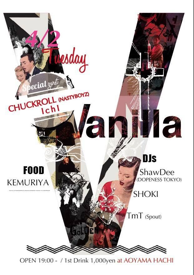 2019.04 02 APR Vanilla HOUSE HIPHOP SOUL 0 Shares Facebook Twitter google Line DATE: 2019-04-02 TUE OPEN: 19:00 VENUE: PRICE: First Drink ¥1000 LINE UP: ■Guest DJ IchI CHUCKROLL(NASTYBOYZ) ■Vanilla DJ’s ShawDee SHOKI TmT ■FOOD KEMURIYA
