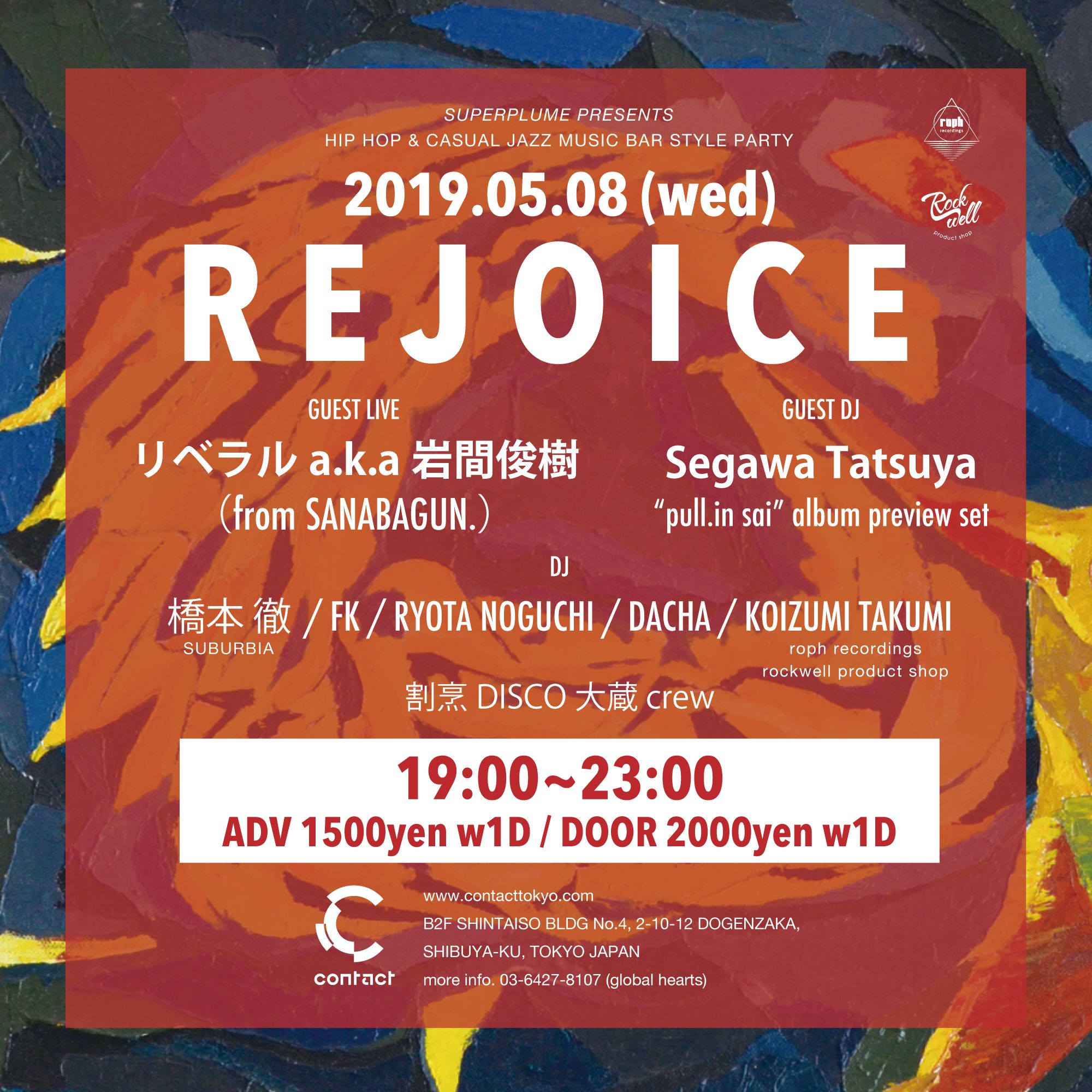 Rejoiceは選曲家 橋本徹、Nujabesのマネージャーやレーべルマネージメントを務め、現在は〈roph recordings〉をマネージメントするKoizumi Takumi、〈Hydeout Productions〉の旗艦店〈Tribe/Guinness Records〉からリリースし、同店のスタッフでもあるFKを中心に、腕利きのセレクターが音楽を担当する。“等身大かつ自分達にとってリアルなジャズやヒップホップ”、“本当に音楽を愛する人たちが安心して和める場所”をコンセプトに掲げ、ジャズ&ヒップホップを中心に良質な音楽を気ままに楽しめるイベント。