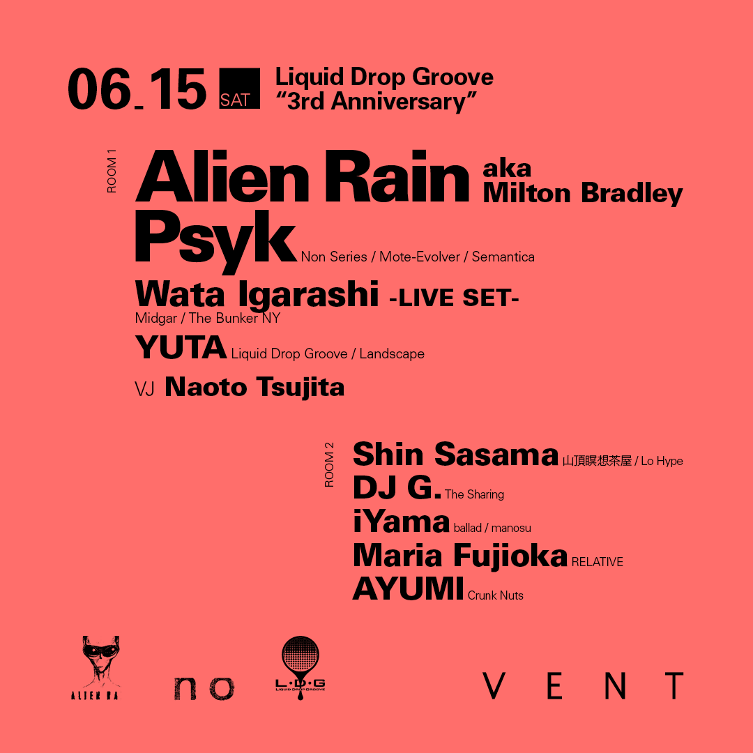 Do Not Resist The Beatレーベルを率いるベルリン・テクノの異彩Milton Bradleyの変名アシッド・テクノプロジェクトAlien Rainと、Luke Slater、Oscar MuleroやRobert Hoodもお気に入りと公言する現在のテクノシーンにおける重要人物の一人であるPsykの2人がダブルヘッドライナーとして6月15日に行われるLiquid Drop Grooveの3周年パーティーに出演が決定!