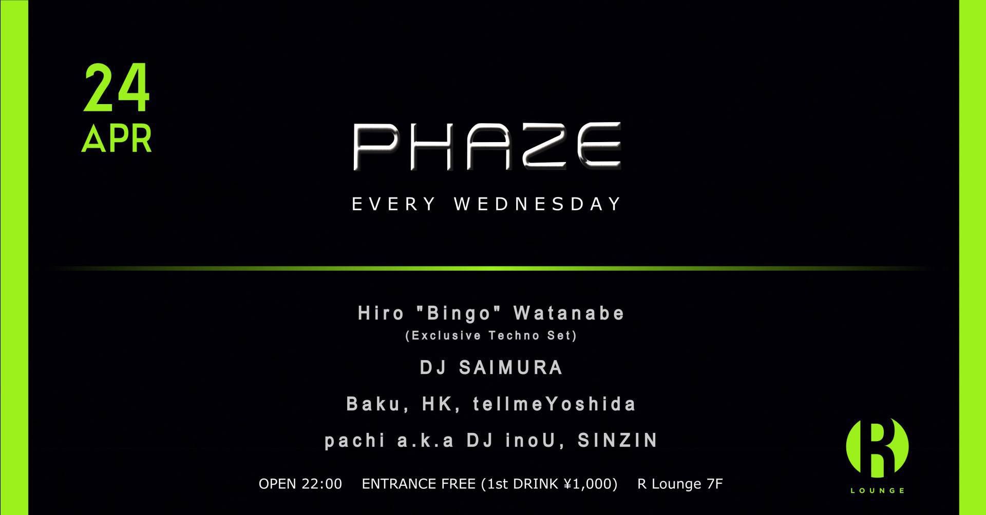 毎週水曜日のR LOUNGE 7Fにてテクノ、ハウスを中心に最新のダンスミュージックを発信するパーティ『PHAZE』