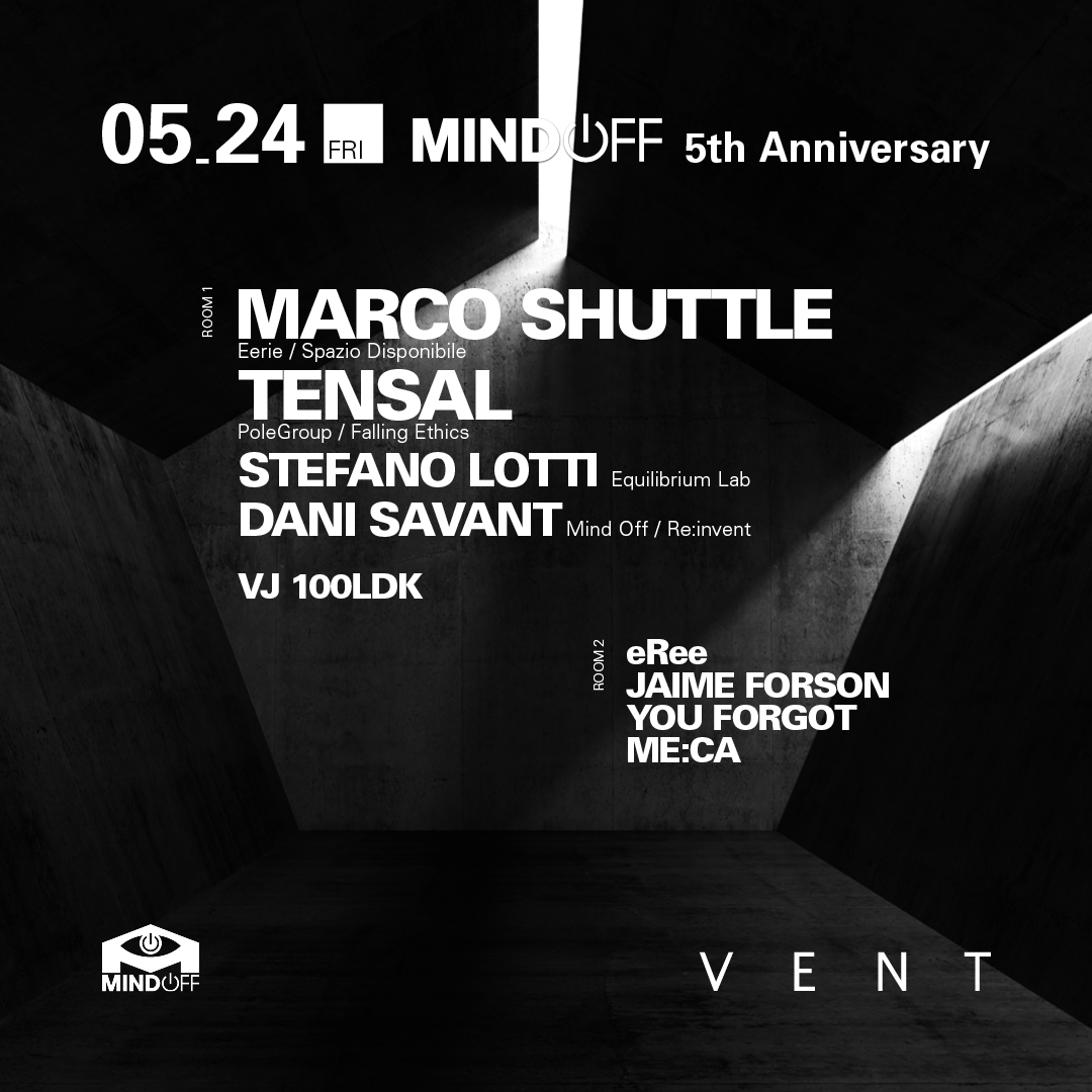 VENTで定期的に開催されてきた人気パーティーMind Offが5周年を迎える!過去のイベントではOscar Mulero、Scuba、Tobias、Pig&Dan、Alex Bau、Kanding Ray、Jonas Koppなどの素晴らしいアクトを迎えて行われてきたが、今回の5周年パーティーにはMarco ShuttleとTensalの2人を迎えて5月24日に開催!
