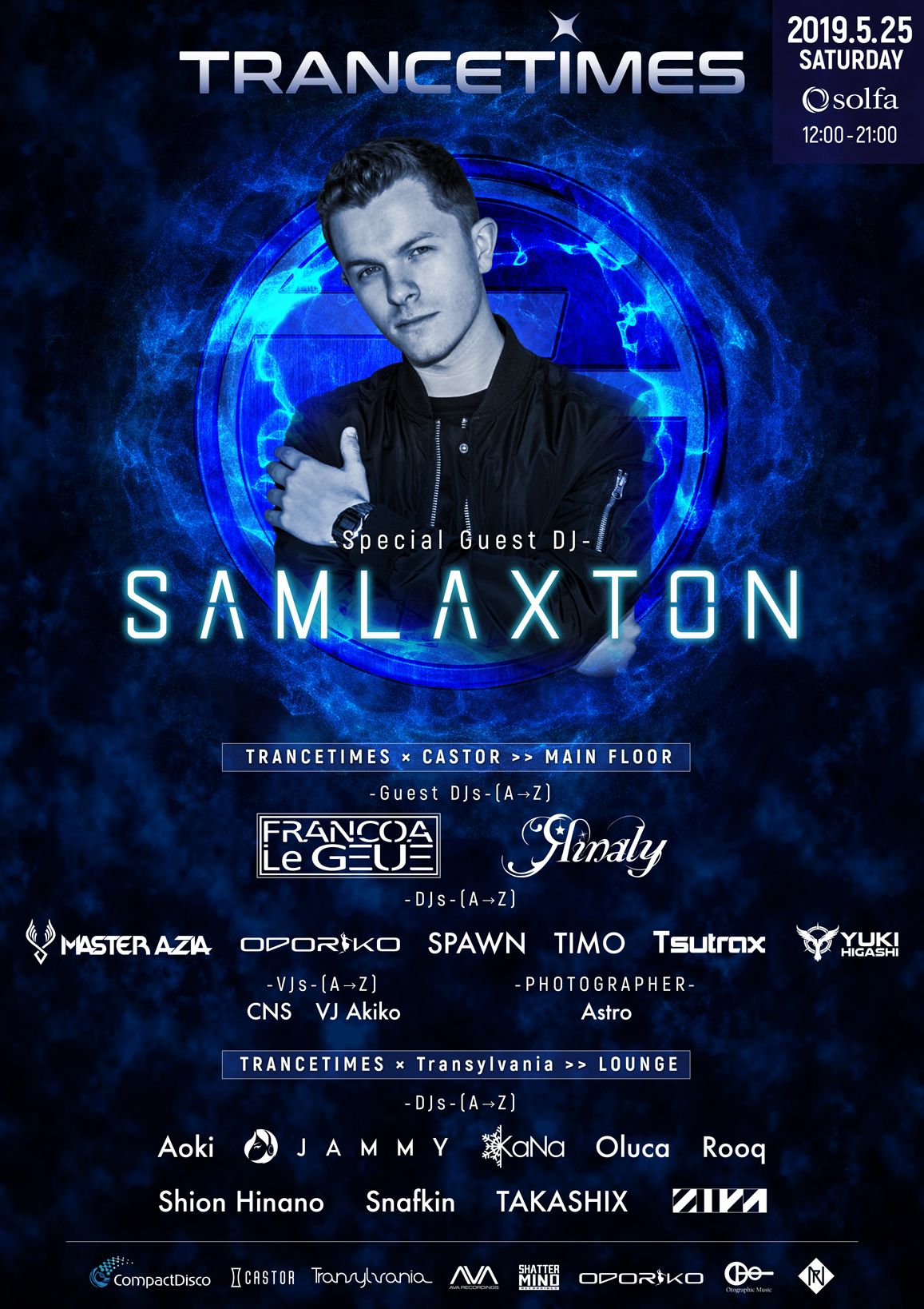 スペシャルゲストにSAM LAXTONを迎えてTRANCETIMES、CASTOR、Transylvaniaを開催!メインフロアはTRANCEで大いに盛り上げ、ラウンジはPROGRESSIVEを中心に心地良い空間を作ります。