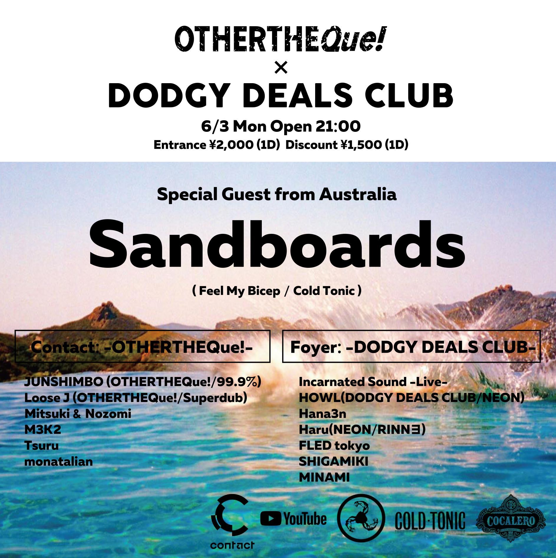 今回は、Bicep〈Feel My Bicep〉や、Krystal Klear 〈Cold Tonic〉が激プッシュする新進気鋭のハウスミュージックアーティストSandboardsが、初来日にてOTHERTHEQue! x DODGY DEALS CLUBに登場。