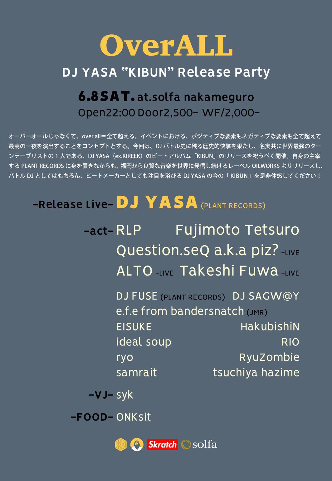 今回は、DJバトル史に残る歴史的快挙を果たし、名実共に世界最強のターンテーブリストの1人である、DJ YASA(ex.KIREEK)のビートアルバム「KIBUN」のリリースを祝うべく開催。