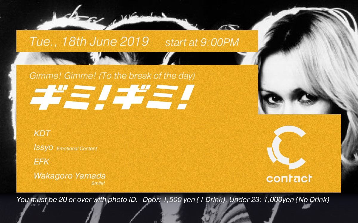 2019年からスタートした“ギミ!ギミ! - Gimme! Gimme! (To the break of the day) -”は、KDT、Issyo を中心にディスコ/ハウスラバーを招聘し、平日ならではのContactフロアを創り上げる。