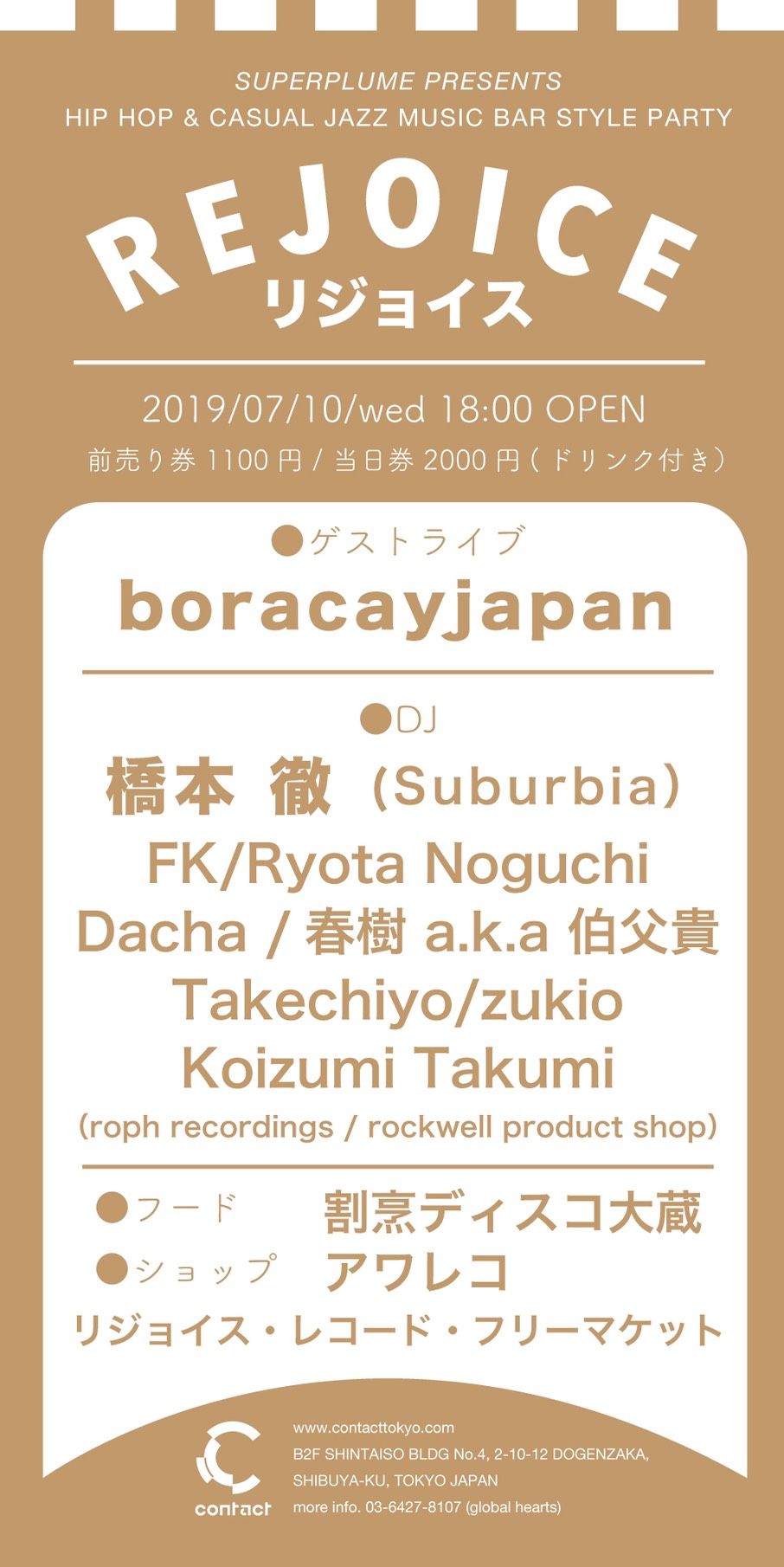 Rejoiceは選曲家 橋本徹、Nujabesのマネージャーやレーべルマネージメントを務め、現在は〈roph recordings〉をマネージメントするKoizumi Takumi、〈Hydeout Productions〉の旗艦店〈Tribe/Guinness Records〉からリリースし、同店のスタッフでもあるFKを中心に、腕利きのセレクターが音楽を担当する。“等身大かつ自分達にとってリアルなジャズやヒップホップ”、“本当に音楽を愛する人たちが安心して和める場所”をコンセプトに掲げ、ジャズ&ヒップホップを中心に良質な音楽を気ままに楽しめるイベント。