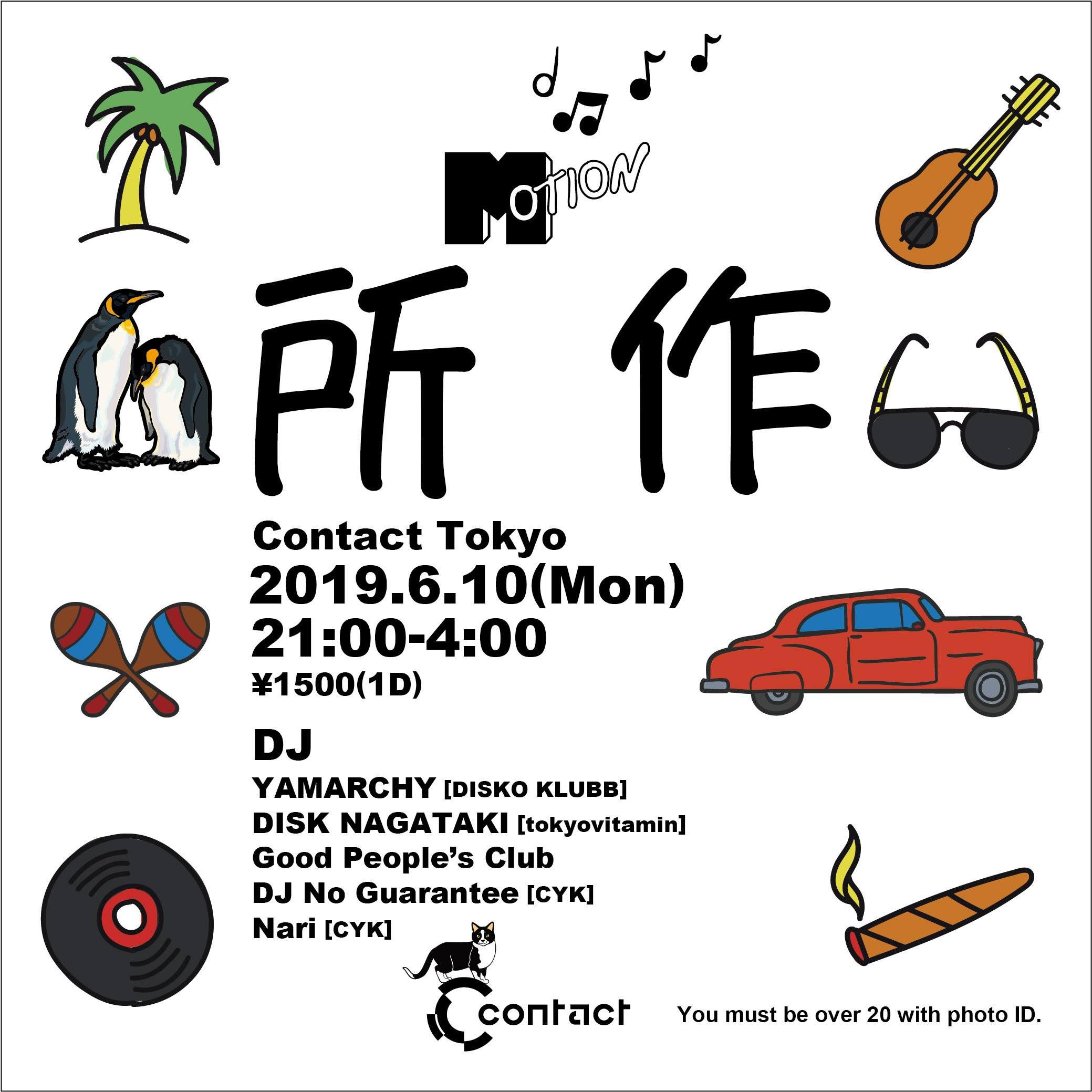 Contactの平日の彩りとなる所作 “motion”は、NariとDJ No Guarantee、ハウスミュージック・コレクティブCYKの2人がホスト。フロアも含む個々人の美を顕現させるべく、第1回目にはDISCO KLUBBのYAMARCHY、tokyovitaminのDisk Nagataki、そしてGood People’s Clubらが登場する。
