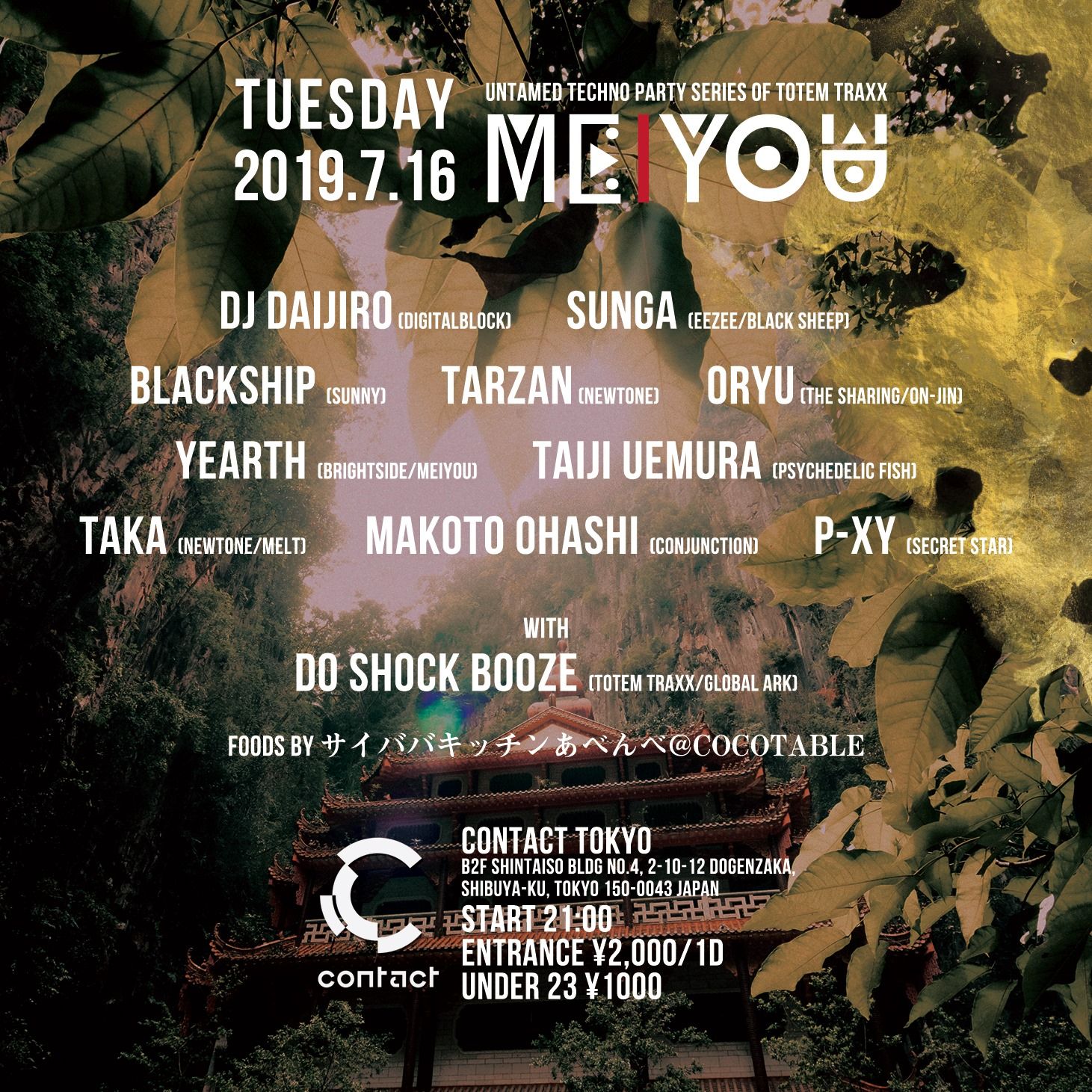 今回は、主宰のDo Shock Boozeと共に、プログレッシブサウンドを基本にテクノ/ハウス/サイケデリックを織り交ぜフロアを異空間へと昇華させるストーリー性の高いプレイスタイルを持ち、MEiYOUにも定期的に出演を重ねているDJ DAIJIROが登場する。初登場となるSungaは、Corehead主宰BLACK SHEEP所属、楽曲制作やリリースも積極的に行い、Summer Sonic 2013のCM曲も手掛けている。DiezoneとKenji Okano (DJ SEU sg) により結成されたDJユニットBLACKSHIPは正に黒船。2012年からは毎年イビサでも活動している実力派コンビだ。Tarzanは、東京で活躍するスケートクルーKP TOKYOのフィクサーであり、遊びの達人としてMEiYOUへ初参加、パーティNewtoneの首謀者でもある。