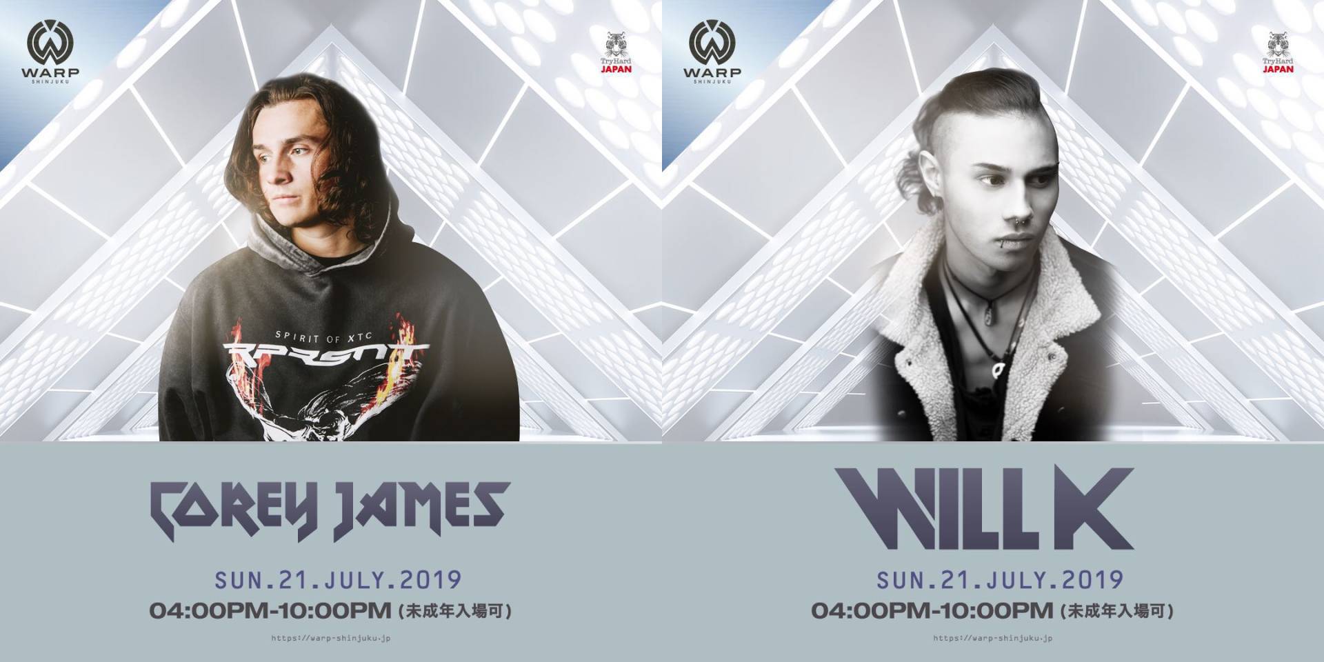 音好き、FES好き、未成年も楽しめるWARPが誇る看板デイパーティーに、Steve Angello が主宰する人気レーベル「SIZE Records」に所属する要注目アーティスト、Corey James(コーリー・ジェームス)、Axwellが主宰する人気のレーベルAxtone 、SIZE, Spinnin, Protocol, Armadaなどダンスミュージック界の主要レーベルから続々とリリースを続けるWILL K 2組が登場!!