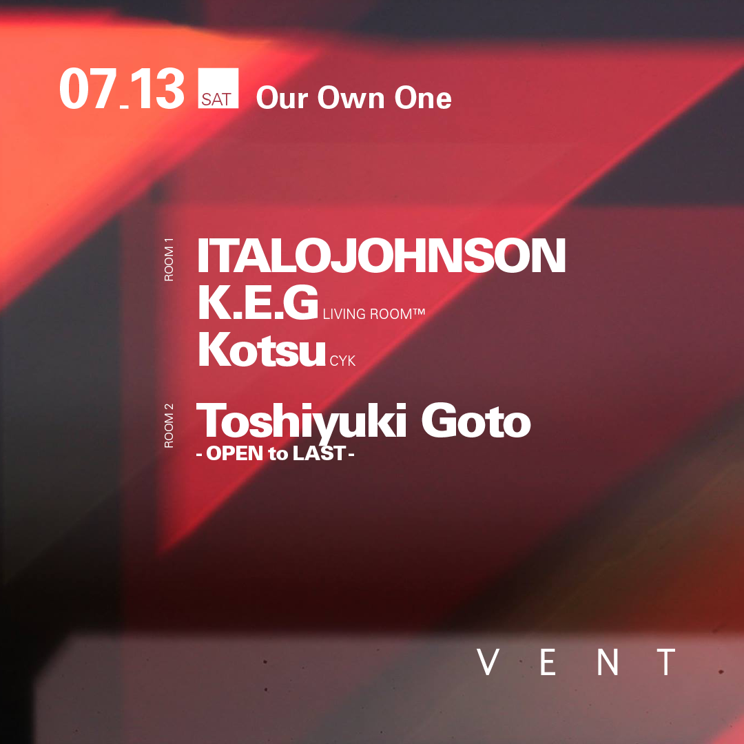 新パーティーOur Own Oneは、VENTでも素晴らしいパフォーマンスを披露しているK.E.Gが、自分の求める理想的なパーティーを創るべく7月13日についに始動するものだ。パーティーにはDJとオーディエンスの間に、途切れない最高のgrooveがあるということを、今のシーンに伝える事を宿命に思ったK.E.Gは、Our Own Oneのフィルターを通してそのヴィジョンを伝えていこうとしている。