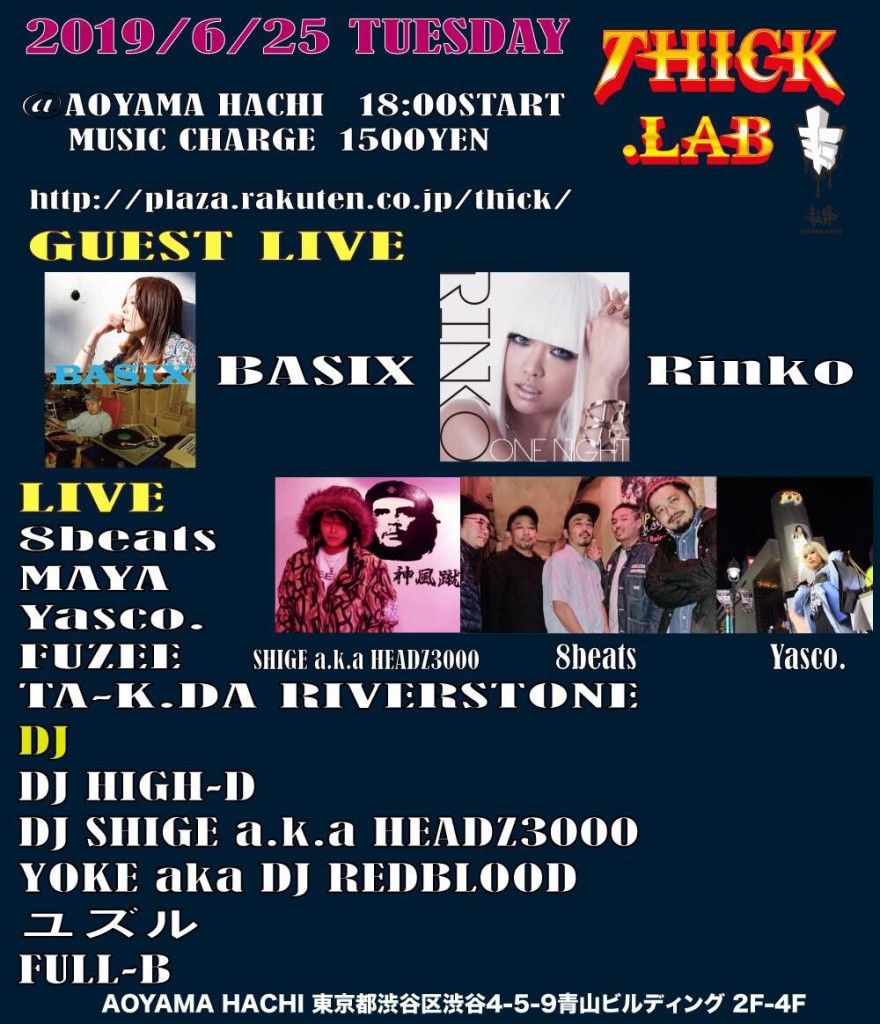 2019.06 25 JUN thick.lab HIPHOP ALLMIX 0 Shares Facebook Twitter google Line DATE: 2019-06-25 TUE OPEN: 18:00 VENUE: PRICE: DOOR: ¥1500 LINE UP: ■GUEST LIVE BASIX Rinko ■DJ DJ HIGH-D DJ SHIGE a.k.a HEADZ3000 YOKE aka DJ REDBLOOD ユズル FULL-B ■LIVE 8beats MAYA Yasco. FUZEE TA-K.DA RIVERSTONE ■FOOD FUZEE 青山蜂にて偶数月第四火曜日に行われているPARTY、東京発UNDERGROUND HIPHOP EVENT thick.lab(シックラボ)。 2002年より開始された長寿EVENT! 様々なアーティストが集う心地よい音の空間THICK.LAB,是非ご参加あれ。 THICK HOMEPAGE https://plaza.rakuten.co.jp/thick/ THICK TV VOL.1 https://www.youtube.com/watch?v=Mxc1I1JAsZo&feature=youtu.be