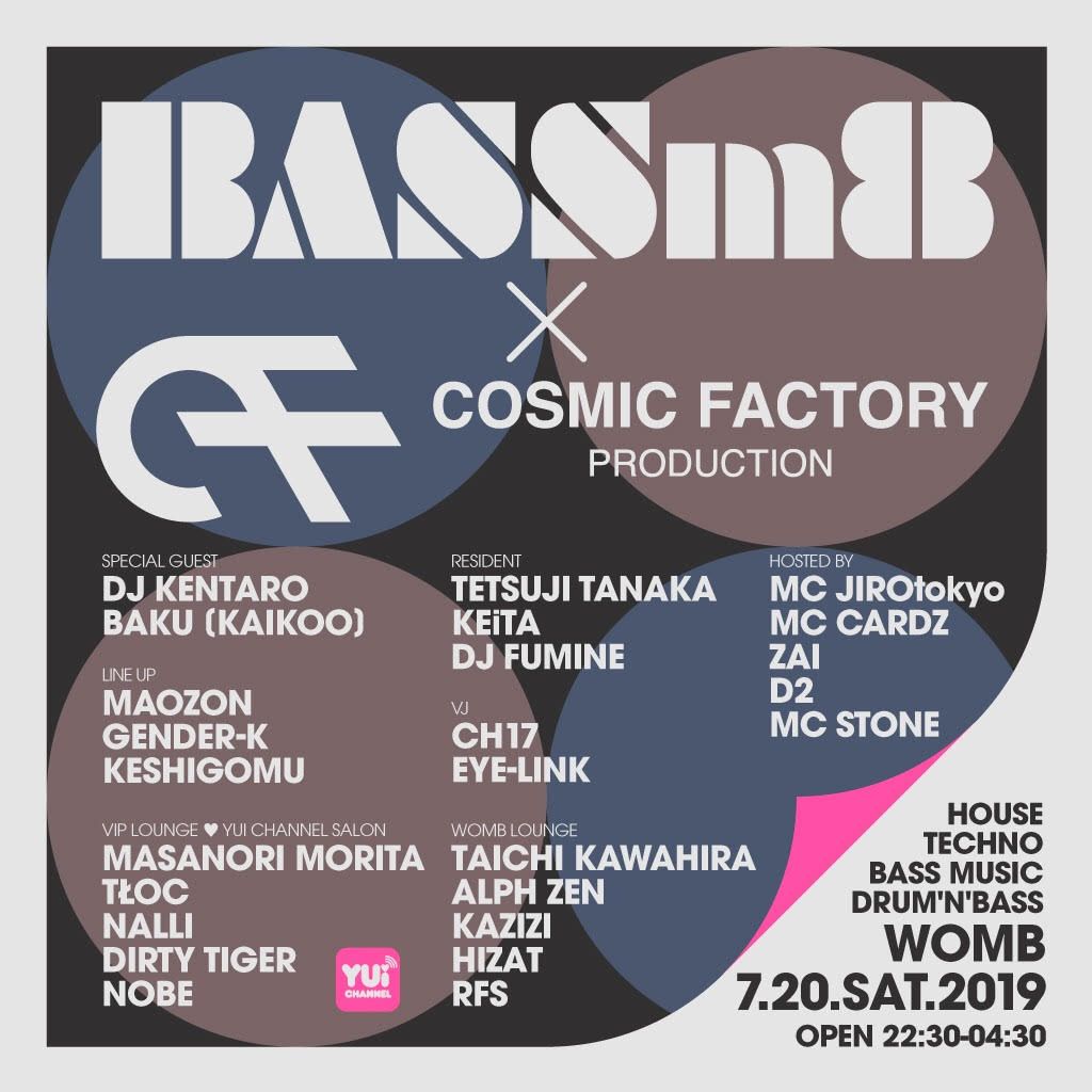 めまぐるしく流行が移りゆく現在のダンスミュージックシーンの中、イギリスを発祥とする唯一無二の音楽ドラムンベース。今もなおその重低音と高速で駆け抜けるビートに魅了され世界中にヘッズの絶えないこの音楽の魅力をより多くの人に届けるため、シーンの未来を導くパーティー ”BASSm8" の WOMB レギュラーが COSMIC FACTORY とのコラボで、7月第3土曜に 1DJ1MC の日本を代表するアクトが集結したドラムンベース祭典を開催!