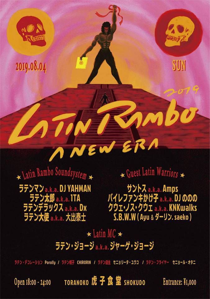 今年2019年度版も、去年に続き8月4日(日)の夕方から終電までの時間帯で、老若男女ばっちこい!なサンデー・ラテン・セッションを繰り広げる。今年も素敵なゲストを招き少々スパイシーなベースが効いたラテン広大解釈の祭典、令和最初のLatin Rambo2019開会宣言!!