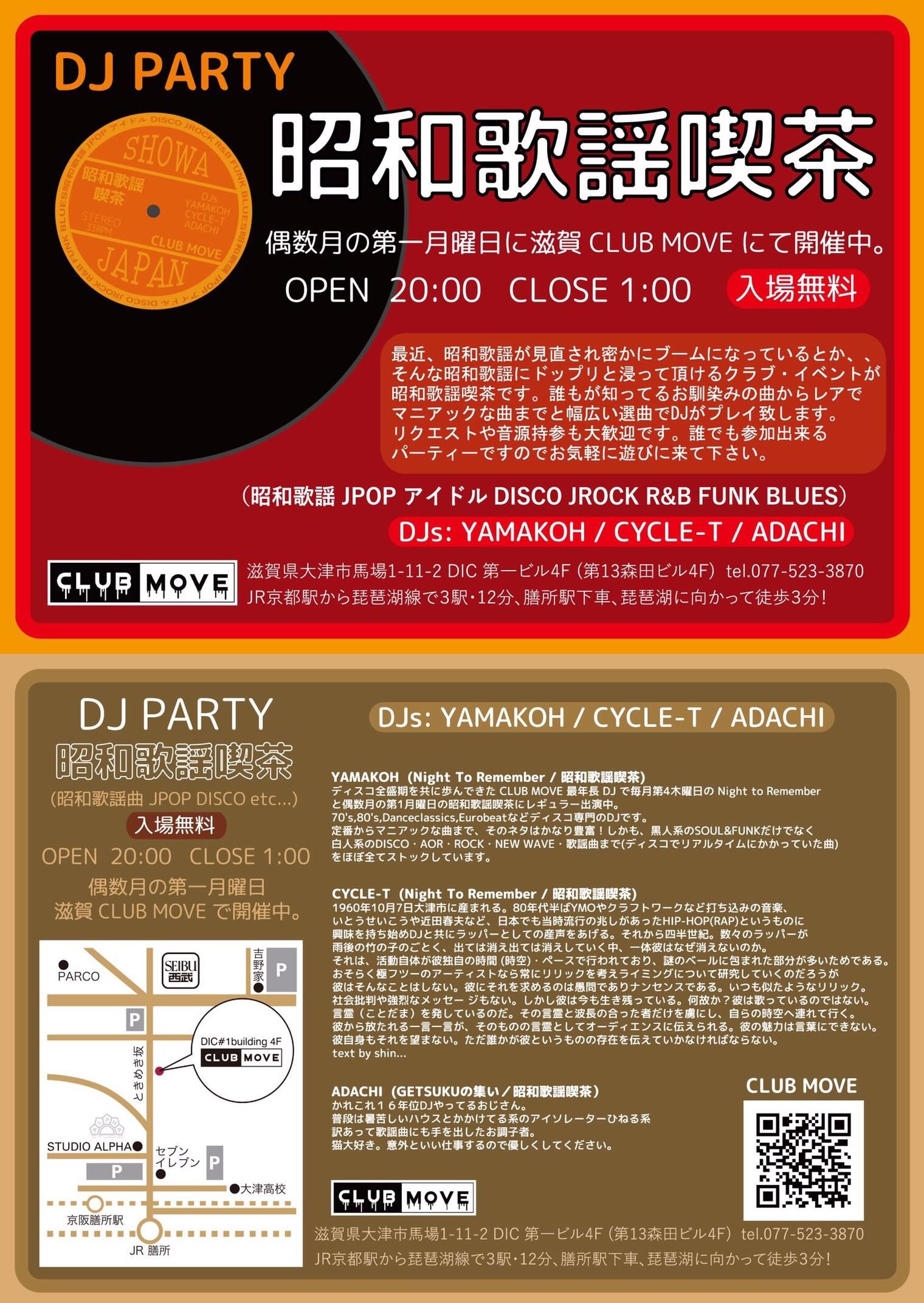 偶数月の第一月曜日に滋賀CLUB MOVEにて開催中。この日の音楽は昭和のスナックにタイムスリップ。最近、昭和歌謡が見直され密かにブームになっているとか、、そんな昭和歌謡にドップリと浸って頂けるクラブ・イベントが昭和歌謡喫茶です。誰もが知ってるお馴染みの曲からレアでマニアックな曲までと幅広い選曲でDJがプレイ。リクエストや音源持参も大歓迎。誰でも参加出来るパーティーですのでお気軽に遊びに来て下さい。