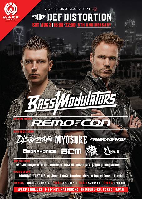 DefDistortionは、2014年8月に横浜で誕生。日本では数少ないHardstyleのパーティーとして、ファンのニーズに応えるべく毎月第1土曜日開催を休まず継続。本開催で70回開催!5年の節目を迎える今回は、Atmozfears、Code Black、Wildstylez、Zatox等の来日をサポートしてきたTokyo Massive Style協力の下、新宿の新たなナイトスポットとして話題となっているWARP Shinjukuにて、今年もAnniversaryを開催!2016年のAdrenalize、2017年のRefuzion、2018年のMax Enforcer&E-Lifeに続き、スペシャルゲストには、世界のHardstyleシーンの第一線で活躍するビッグアーティスト、Bass Modulatorsの来日が決定!Defqon.1やQlimax等にも出演する世界レベルの彼らのプレイを間近で見れるチャンス!更に国内出演陣も、Hard系イベントで活躍する人気アーティストに加え、各地で活躍するDJ達がこの日のためにWARP Shinjukuに大集結!年に一度の特別仕様!DefDistortion 5th Anniversaryをどうぞお楽しみに!8月3日㈯はWARP Shinjukuにてお待ちしております!