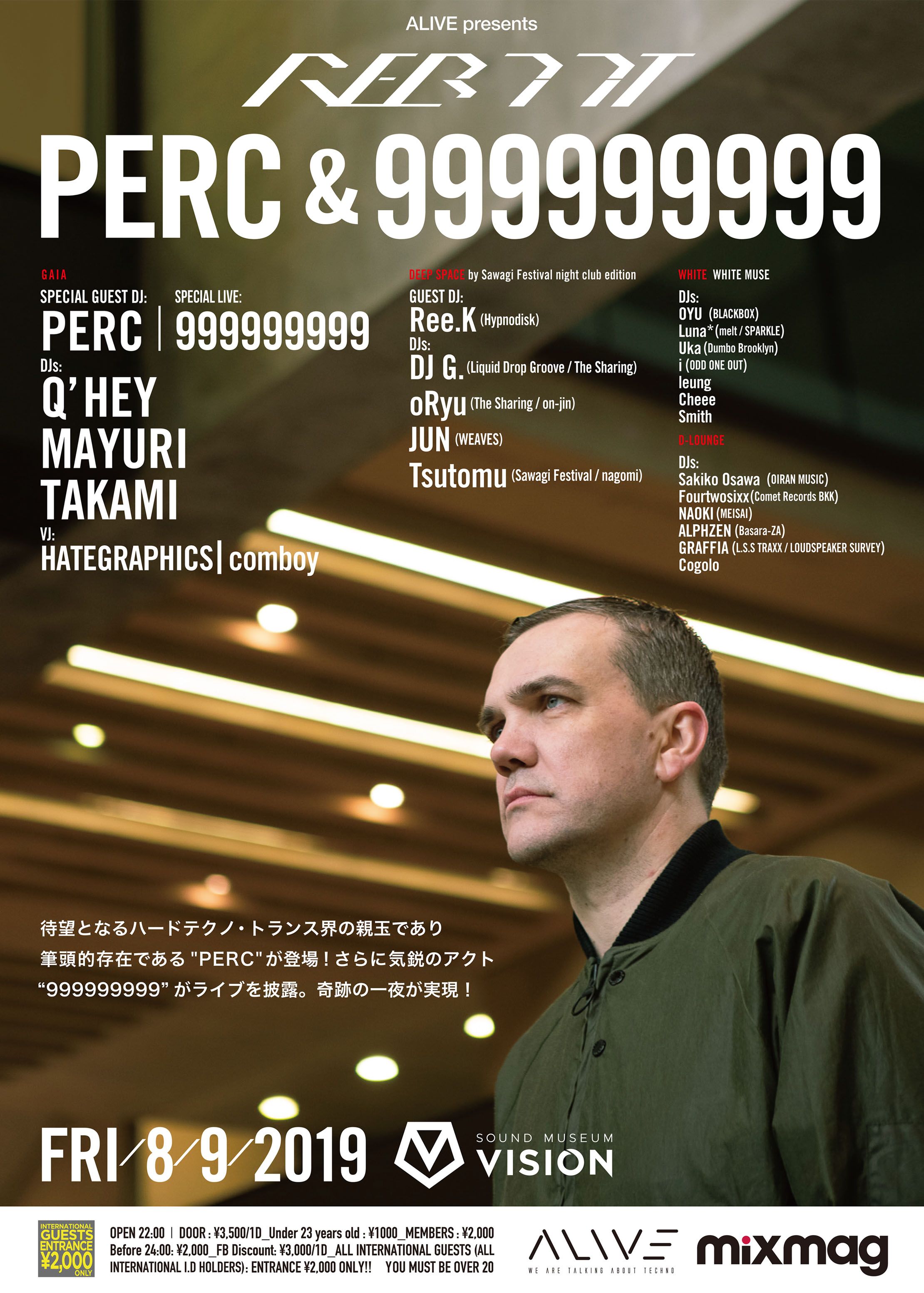 待望となるハードテクノ界の親玉であり筆頭的存在である"PERC"がVISIONに登場する。さらに気鋭のアクト“999999999”がライブを披露。奇跡の一夜が実現!