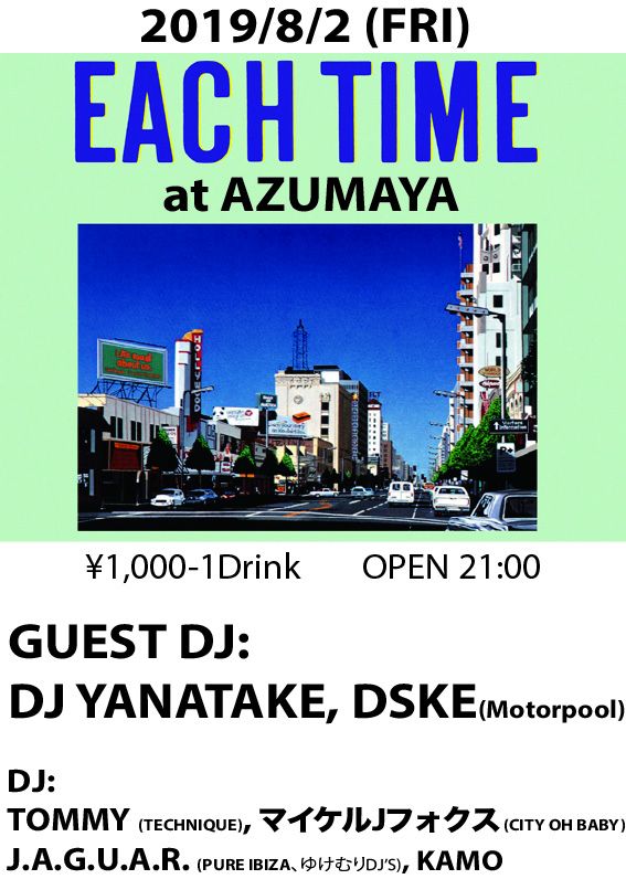 2019.08 02 AUG Azumaya -Friday- J-POP 0 Shares Facebook Twitter google Line DATE: 2019-08-02 FRI OPEN: 21:00 VENUE: PRICE: Entrance 1,000yen (incl.1drink) LINE UP: DJ YANATAKE DSKE(Motorpool) TOMMY(TECHNIQUE) J.A.G.U.A.R.(PURE IBIZA / ゆけむりDJs) マイケルJフォクス(CITY OH BABY) KAMO