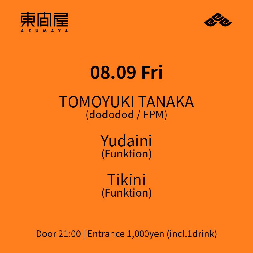 2019.08 09 AUG Azumaya -Friday- HOUSE 0 Shares Facebook Twitter google Line DATE: 2019-08-09 FRI OPEN: 21:00 VENUE: PRICE: Entrance 1,000yen (incl.1drink) LINE UP: TOMOYUKI TANAKA(dododod / FPM) Yudaini(Funktion) Tikini(Funktion)