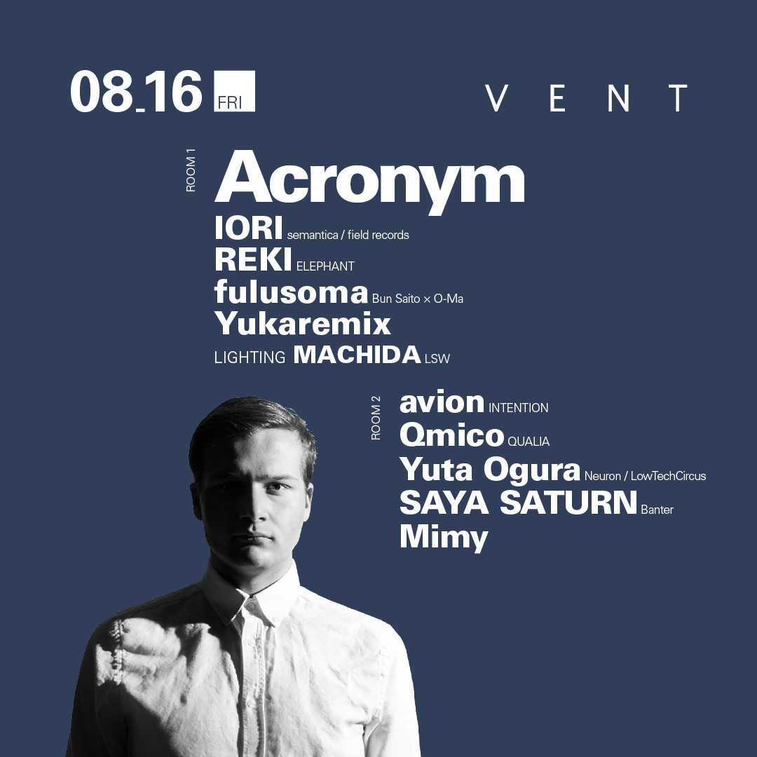 催眠術的な魅力を持つディープでトリッピーなサウンドを武器にスウェーデン発の要注目テクノアクトとして話題沸騰中!ニュースクール・ミニマルシーンの気鋭のアーティストAcronymが8月16日のVENTに初登場!