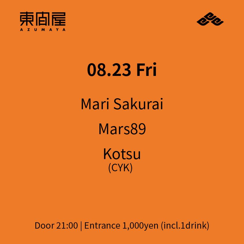 2019.08 23 AUG Azumaya -Friday- TECHNO HOUSE 0 Shares Facebook Twitter google Line DATE: 2019-08-23 FRI OPEN: 21:00 VENUE: PRICE: Entrance 1,000yen (incl.1drink) LINE UP: Mari Sakurai Mars89 Kotsu (CYK)