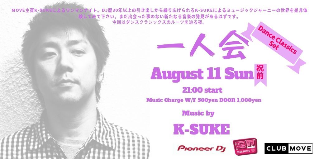 MOVE主賓K-SUKEによるワンマンナイト。DJ歴30年以上の引き出しから繰り広げられるK-SUKEによるミュージックジャーニーの世界を是非体験してみて下さい。まだ出会った事のない新たなる音楽の発見があるはずです。