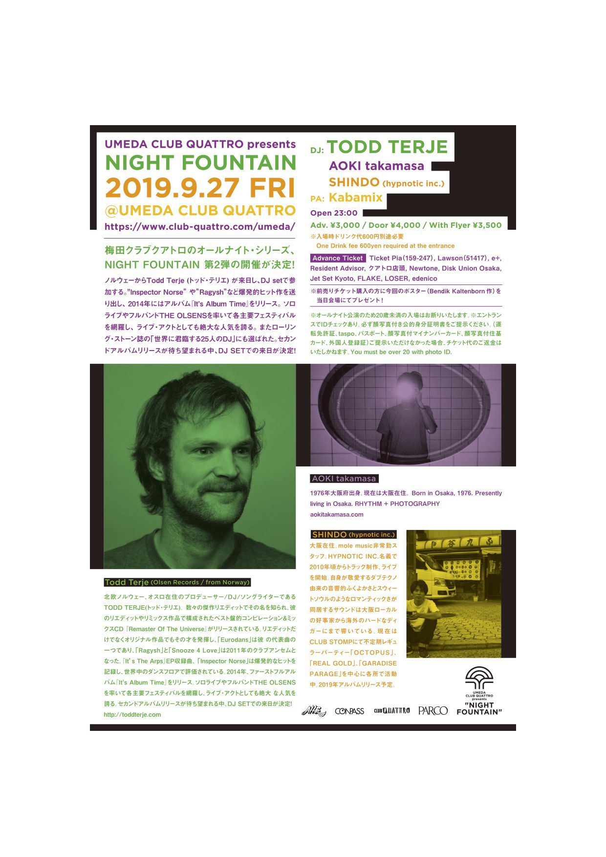 梅田クラブクアトロのオールナイト・シリーズ、NIGHT FOUNTAIN 第2弾の開催が決定!