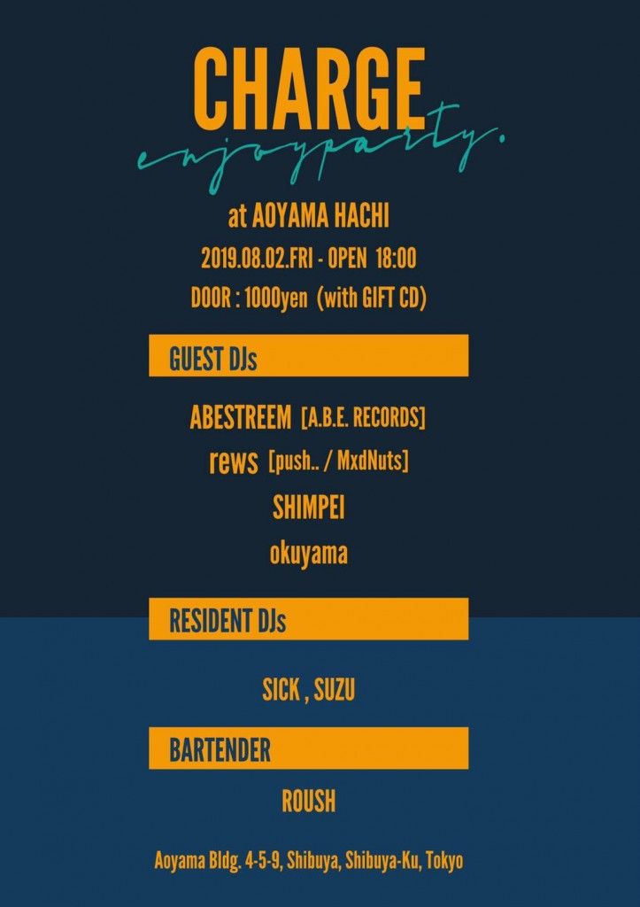 2019.08 02 AUG CHARGE HOUSE TECHNO DISCO 0 Shares Facebook Twitter google Line DATE: 2019-08-02 FRI OPEN: 18:00 VENUE: PRICE: DOOR: ¥1000 / GIFT CD LINE UP: ■Guest DJ ABESTREEM (A.B.E RECORDS) rews (push../MxdNuts) SHIMPEI okuyama ■Resident DJ SICK&SUZU ■Bartender ROUSH