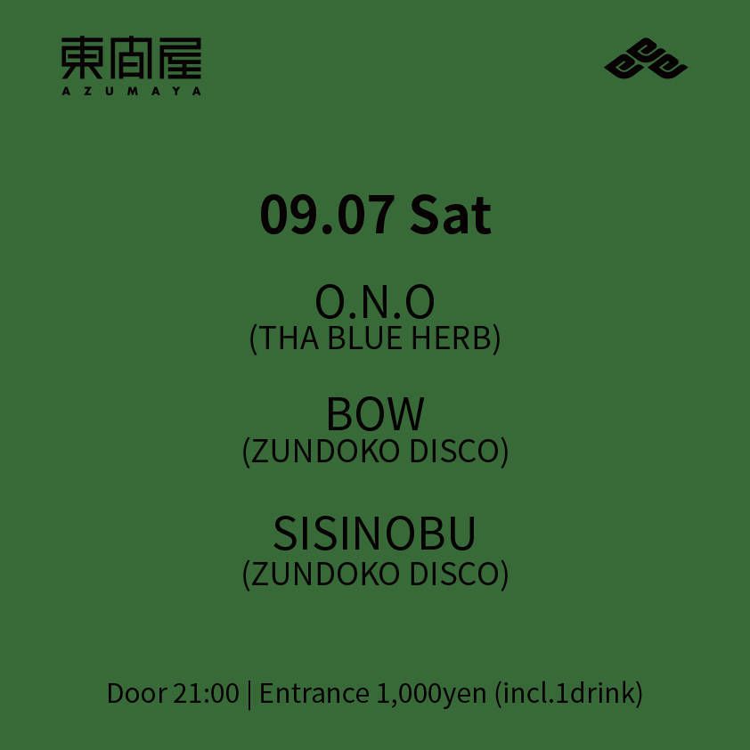 2019.09 07 SEP Azumaya -Saturday TECHNO 0 Shares Facebook Twitter google Line DATE: 2019-09-07 SAT OPEN: 21:00 VENUE: PRICE: Entrance 1,000yen(incl. 1drink) LINE UP: O.N.O(THA BLUE HERB) BOW(ZUNDOKO DISCO) SISINOBU(ZUNDOKO DISCO)