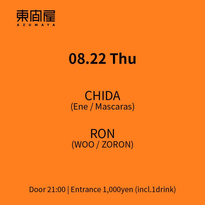 2019.08 22 AUG Azumaya -Thursday- HOUSE 0 Shares Facebook Twitter google Line DATE: 2019-08-22 THU OPEN: 21:00 VENUE: PRICE: Entrance 1,000yen(incl. 1drink) LINE UP: CHIDA(Ene / Mascaras) RON(WOO / ZORON)