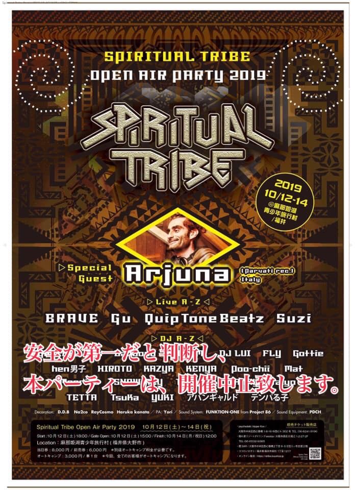 2019/10/12(土)〜10/14(祝)に麻那姫湖青少年旅行村(福井県大野市)で開催を予定しておりましたSpiritual Tribe Open Air Party 2019は、台風19号の接近により開催するのは危険と判断し、皆様の安全を考え、本パーティーは、開催中止とさせて頂きます。