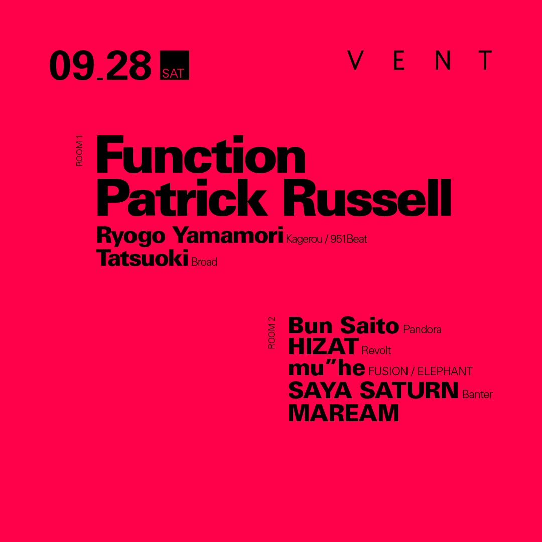 これは超強力なダブルヘッドライナーだ!Sandwell Districtとしてテクノシーンに大きな影響を与えて数々の伝説を残してきたFunctionと、USのアンダーグラウンドのシーンにおける真のベテランでありいまやニューヨークのテクノシーンを牽引するあPatrick Russellが9月28日のVENTにダブルヘッドライナーとして出演が決定!