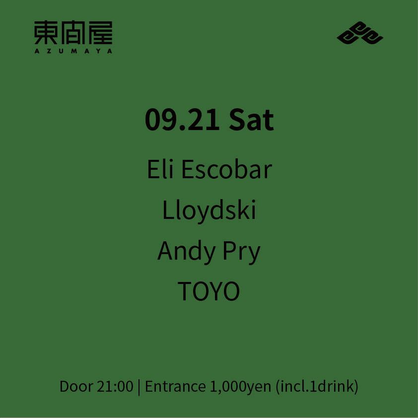 2019.09 21 SEP Azumaya -Saturday HOUSE 0 Shares Facebook Twitter google Line DATE: 2019-09-21 SAT OPEN: 21:00 VENUE: PRICE: Entrance 1,000yen(incl. 1drink) LINE UP: Eli Escobar Lloydski Andy Pry TOYO
